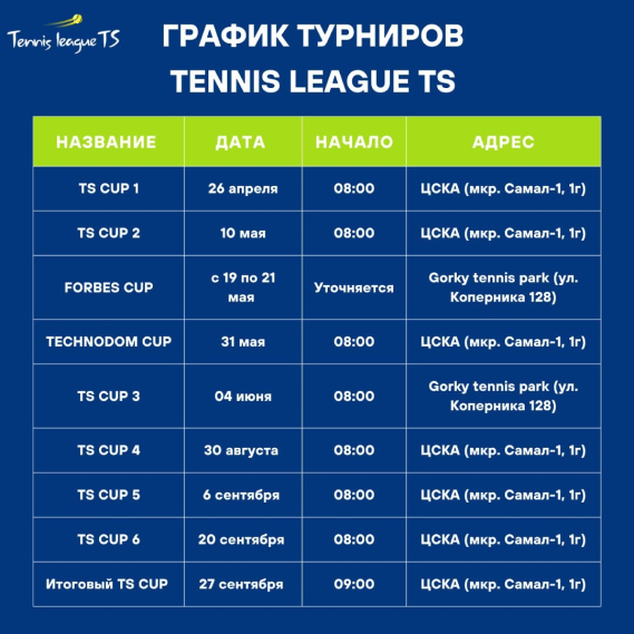 Также уведомляем вас о том, что почти все турниры в серии TLTS, кроме Forbes Cup и ТS CUP3, будут проведены на кортах ТЦ ФТК «ЦСКА». Турниры Forbes Cup и ТS CUP3 пройдут на кортах ТК Gorky Tennis Park.